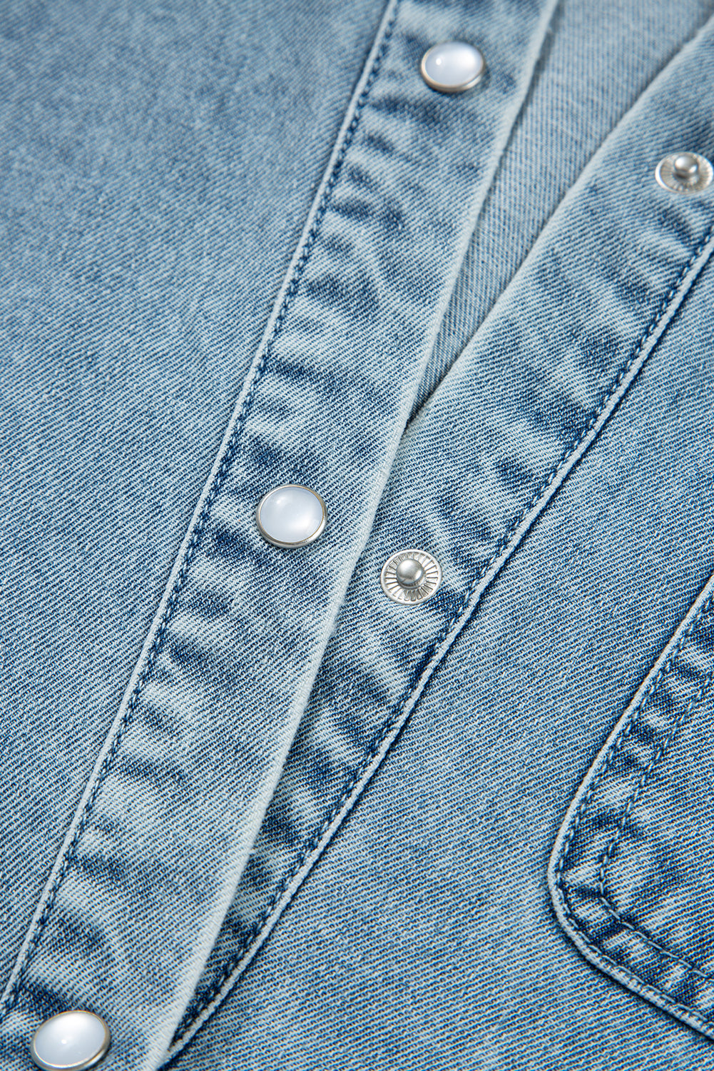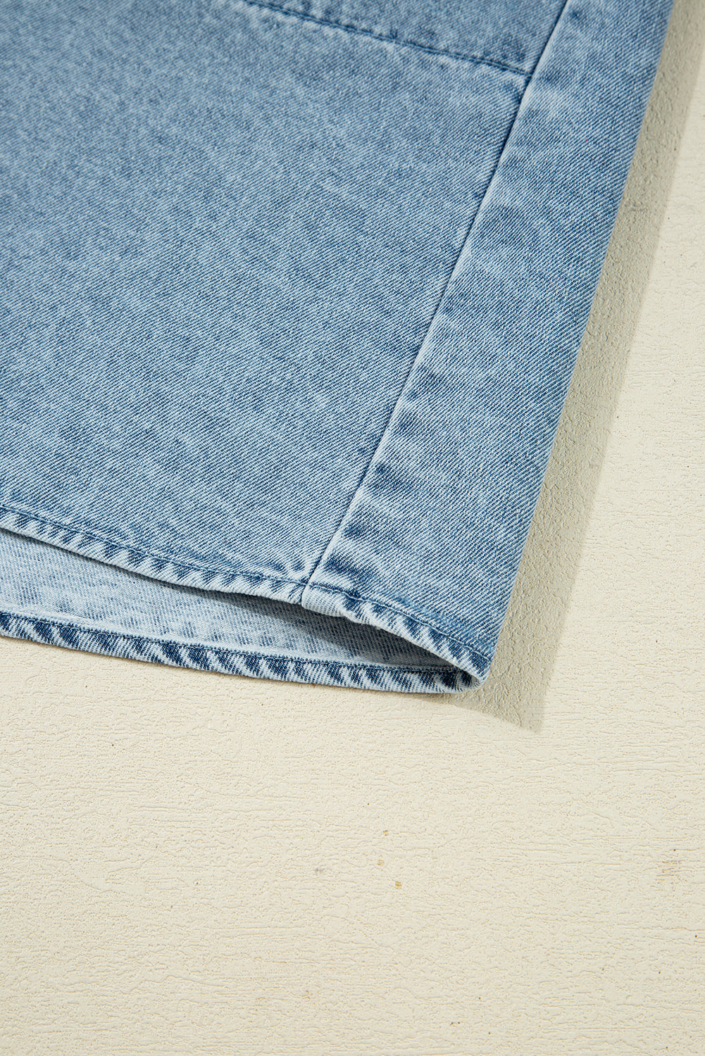 Beau Blue Smocked Cuffs Flared Denim Shirt Mini Dress