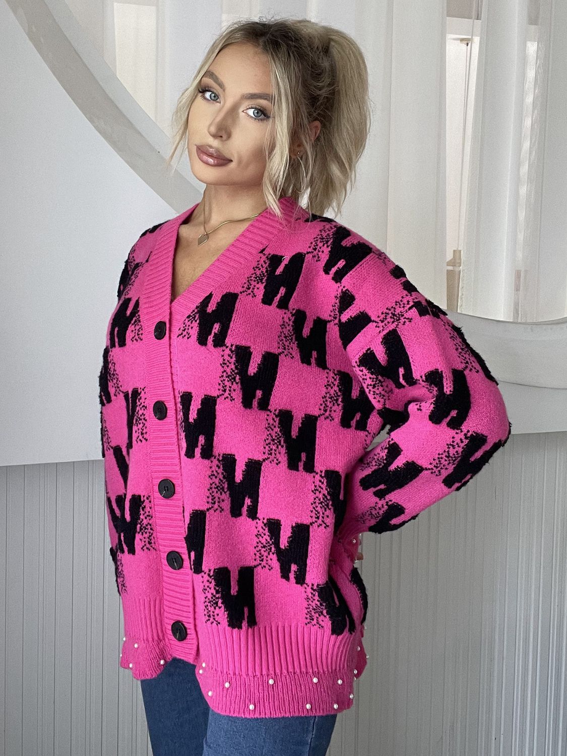 Pearl Trim V-Neck Button Up Cardigan